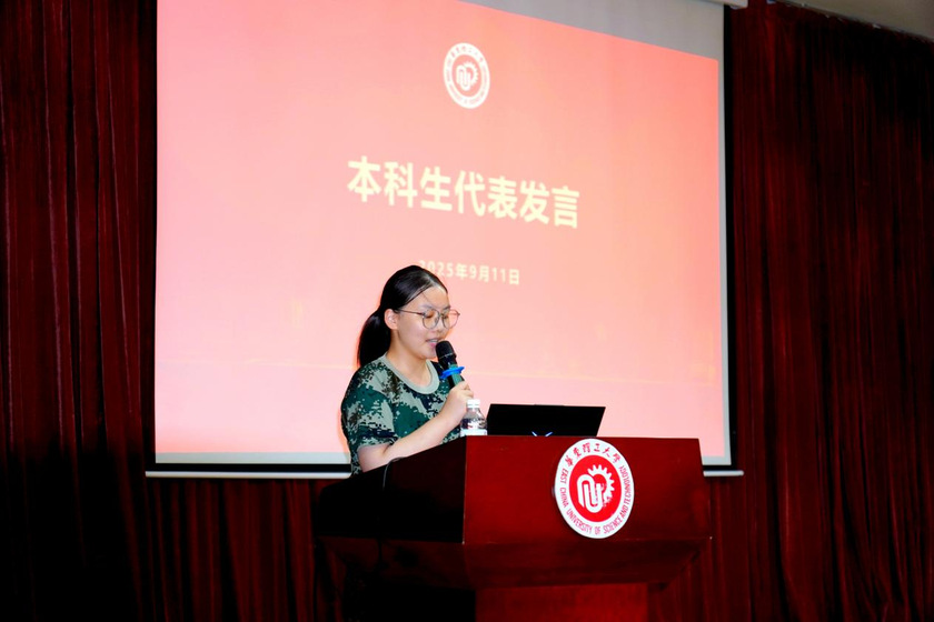 英语251班的季吴悠同学代表本科生新生发言。她分享了自己进入大学的心情和感受,表示进入大学有更广阔的平台,也面临更多挑战与机遇,希望大家突破固有思维,积极主动探索;做好未来规划,平衡多样选择;拥抱数智时代,学会传承创新。在华理外院探索星辰大海。